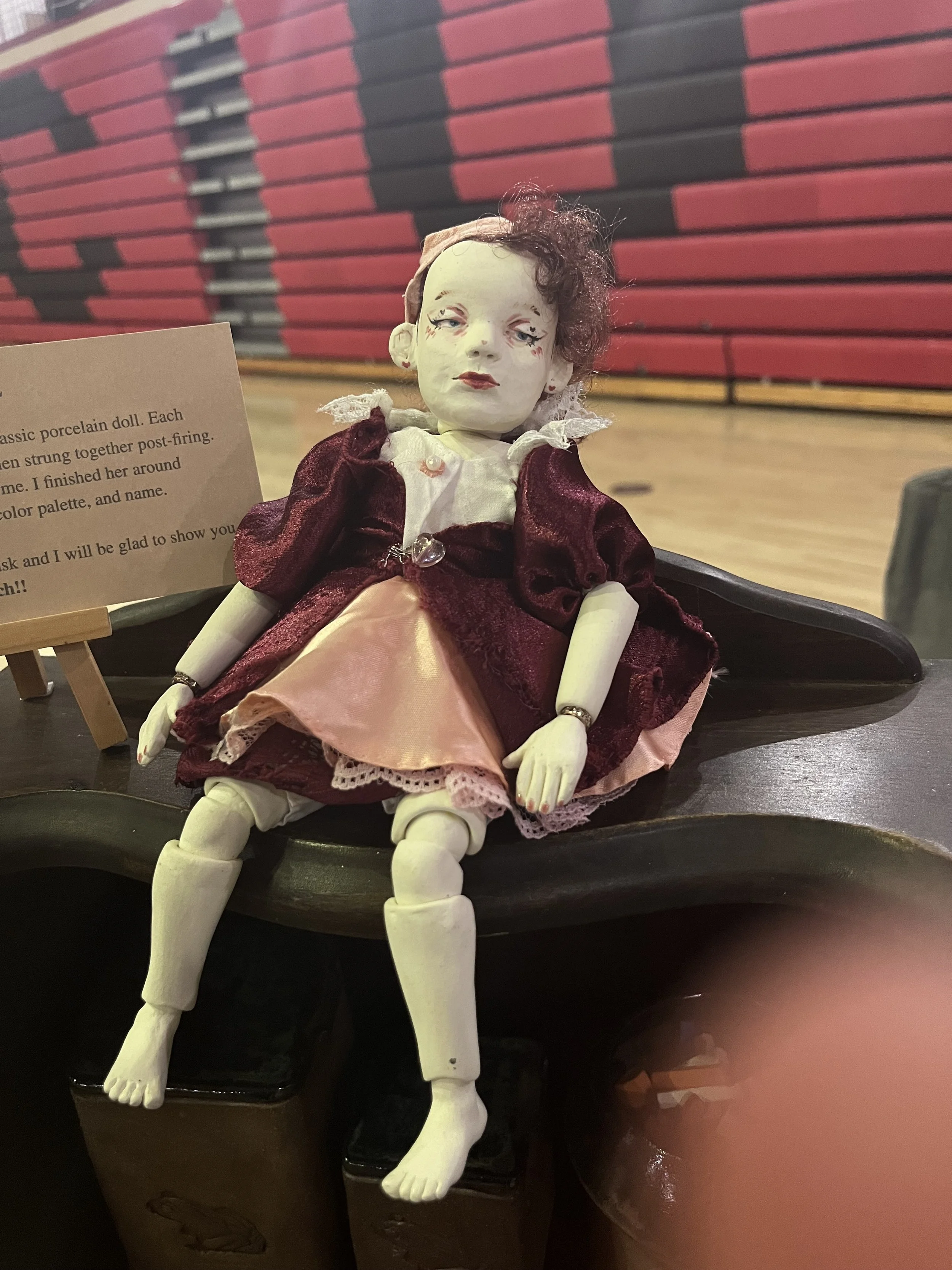 Underglazed white stoneware, doll hair, handsewn clothing
